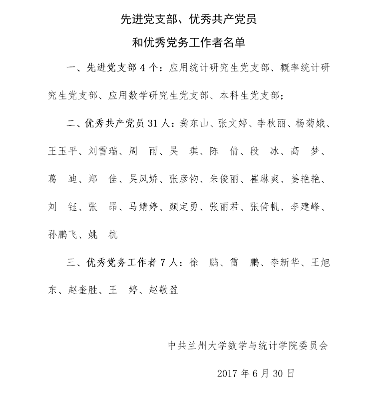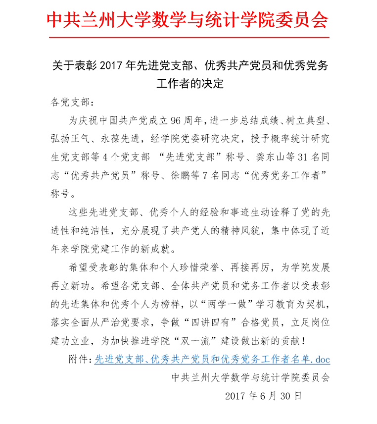 关于表彰2017年先进党支部、优秀共产党员和优秀党务工作者的决定
