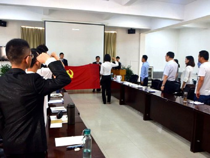 活动最后,与会同志重温入党誓词,在预备党员2015级基地班曾晰微的领誓下,全体党员面对党旗庄严宣誓。