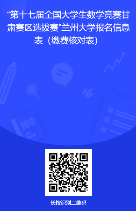 (二)转账(要求留言或备注)后,扫描下图二维码,填写“第十七届全国老员工数学竞赛甘肃赛区选拔赛”l9193永利报名信息表(缴费核对表),务必仔细阅读问卷说明,将个人信息进行准确填写并上传相关交易明细截图及其他信息证明图片。