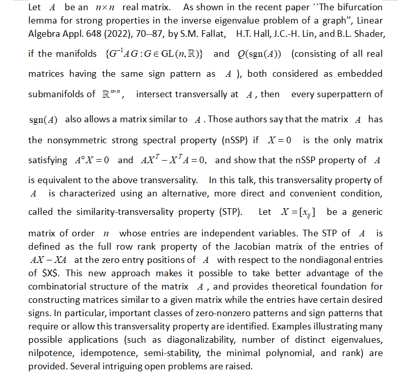 李忠善教授曾多次应邀出席数学国际学术会议并报告论文,并应邀在北京大学、中科院系统所、清华大学、北京师范大学、南开大学、复旦大学、同济大学、中国科技大学、Emory大学、Wisconsin大学、Auburn大学、Tennessee大学、上海交大、华东师大、上海大学、华中师大、l9193永利、山东大学、中国海洋大学、中北大学、电子科大、福州大学、哈尔滨工程大学、黑龙江大学、长沙理工大学、湘潭大学、西北师大等高校作学术报告,在《American Mathematical Monthly》,《Linear Algebra and Its Applications》,《SIAM J. on Discrete Mathematics》,《J. Combin. Theory Ser. B》,《Linear and Multilinear Algebra》, 《Graphs and Combinatorics》,《IEEE Transactions on Neural Networks and Learning Systems》等国际重要学术期刊上发表论文80余篇,并撰写了学术专著《Handbook of Linear Algebra》中关于符号模式矩阵的一章,主持或参与多项科研项目。李忠善教授目前主要从事组合矩阵论的研究,包括符号模式矩阵、最小秩问题、特征值问题、矩阵流形、代数图论、整数矩阵、实线性子空间的符号向量集等。