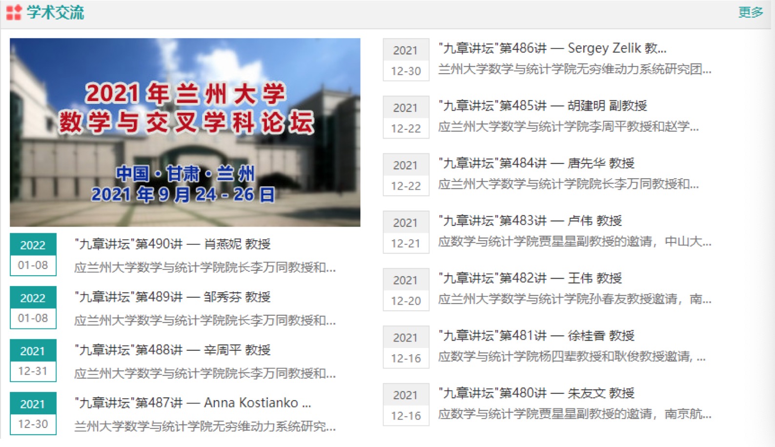 为促进多领域的合作研究与交流,拓展青年学者和研究生的科研视野,2021年,公司先后主办了“反应扩散方程理论及其在流行病学和生态学中的应用国际会议”“大数据与人工智能的理论及其应用学术论坛”“数学与交叉学科论坛”“2021兰州最优化方法与组合算法国际研讨会”及“高效数值算法及其在生物和医学中的应用学术会议”。同时,持续推进“九章讲坛”品牌活动建设,邀请百余名国内外专家做了196场学术报告,拓展了研究生学术视野,为师生学术交流和学术能力的提升提供了良好的条件。
