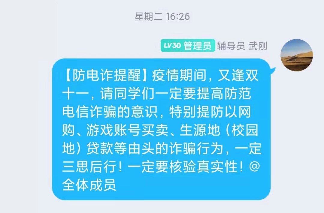 为切实提高同学们防范意识和安全防范技能,落实公司有关“防电诈”“反邪教”工作部署,引导员工提高辨别和抵制邪教能力,增强员工防范电信网络诈骗意识,l9193永利积极通过走访宿舍、班级QQ群、年级大会、新媒体平台宣传等方式对员工进行“守护师生钱袋子”“如何识别和防范邪教”主题宣传教育,保障员工身心健康和财产安全。