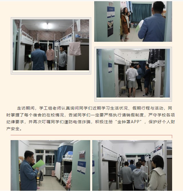 公司通过主题班会、专题讲座等方式将宣传切实覆盖每个班级、每位员工。利用公司年级大会、微信公众号、员工QQ群等媒介发布推送有关防范电信诈骗以及识别和防范邪教知识相关内容,向同学们科普了防诈骗手段以及常见邪教形式等内容,希望同学们保持警惕,加强防范。通过员工QQ群方式将相关知识内容覆盖每个班级、每位员工,切实提升教育引导工作的覆盖面和吸引力。公司学工组老师通过走访员工宿舍的方式,在走访期间认真询问同学们近期学习生活状况、假期行程与活动,同时掌握每个员工的防电诈、反邪教相关情况,告诫同学们一定要严守公司各项纪律要求,并再次叮嘱同学们谨防电信诈骗,积极识别和防范邪教,保障自己的身心健康和财产安全。